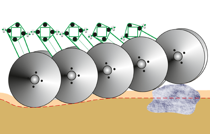 Эластичные резиновые демпферы служат не только для оптимального копирования рельефа почвы, но и в качестве предохранительного механизма для дисков, которые не требуют технического обслуживания и отличаются большим ходом.